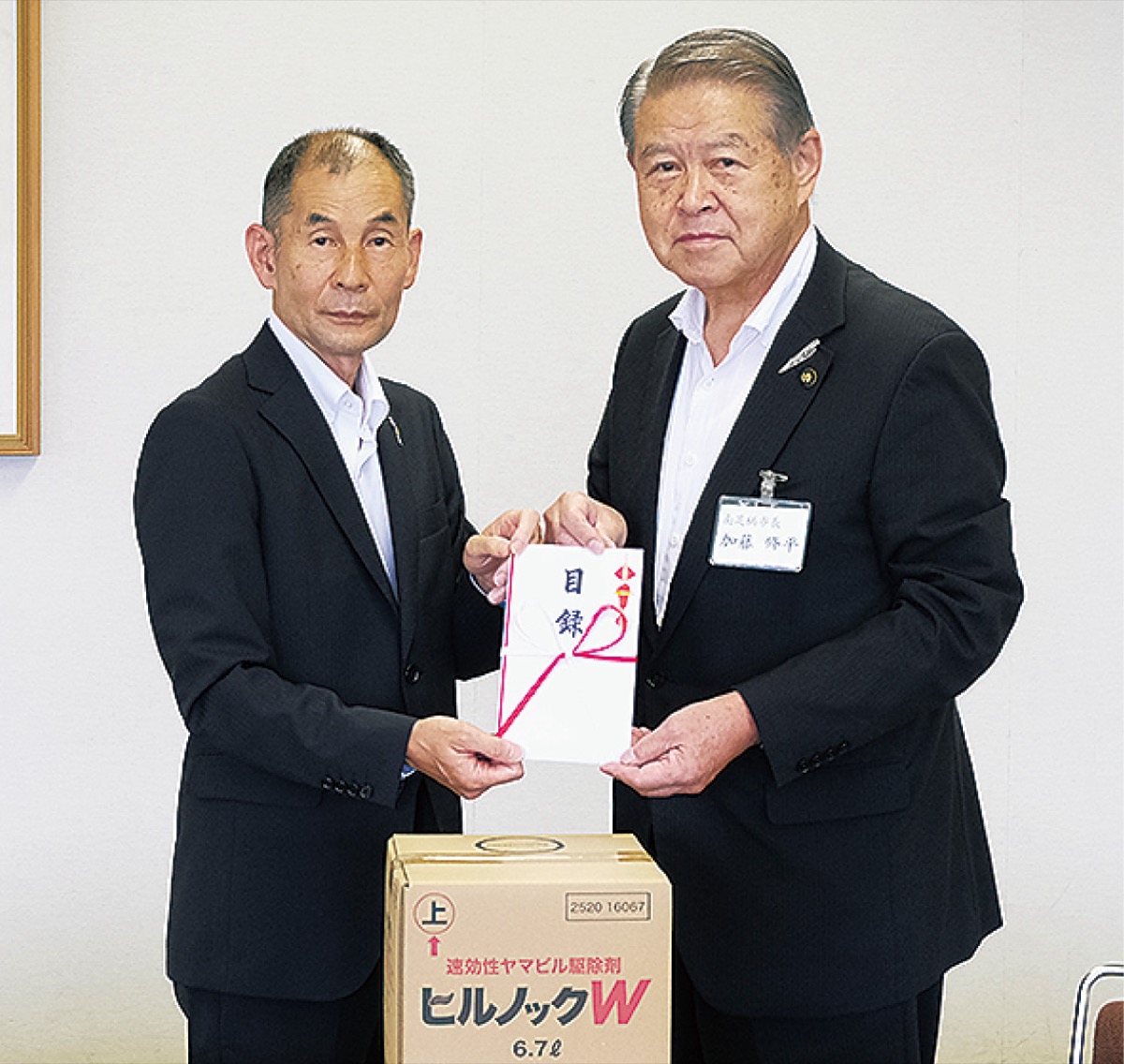 今回寄付された駆除剤は、両地区の自治会に配布し、駆除目的の散布や忌避剤として活用していく予定。