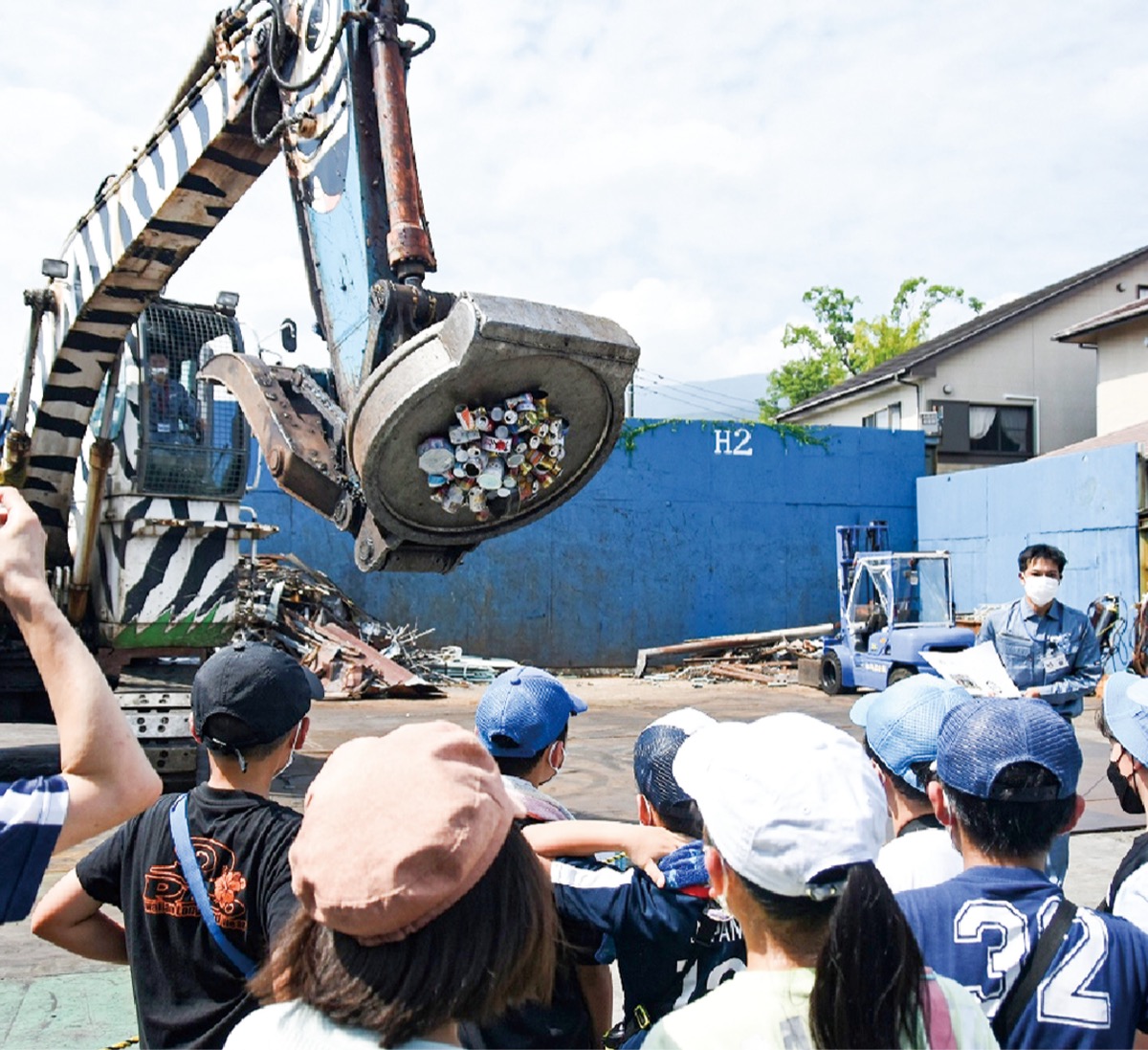 南足柄市の向田小学校区放課後児童クラブの3〜5年生が8月24日、同市中沼にある製鋼原料・アルミニウムの再生加工業、(株)高部金属を訪れ、リサイクルについて学んだ。同社と市による放課後児童クラブの委託先である(株)明日葉は、ともにかながわSDGsパトナーで、持続可能な開発目標の推進に取り組んでいることから、今回の見学に至ったもの。この日は約20人が参加した。