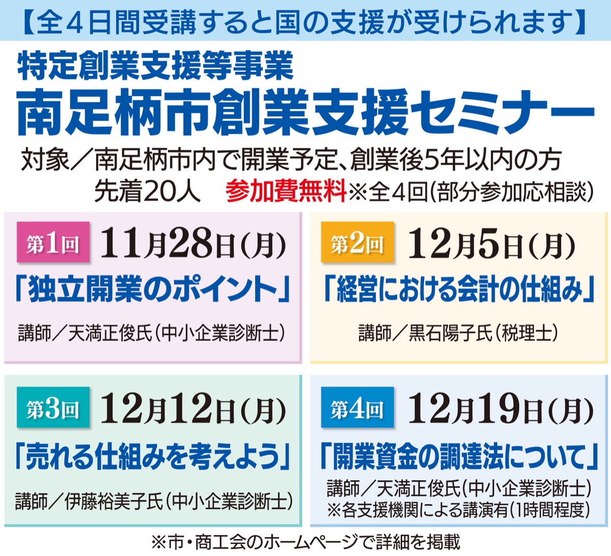 資金調達から売れる仕組みづくりまで、独立開業のイロハを学ぶ「南足柄市創業支援セミナー」(主催/南足柄市、南足柄市商工会)が11月28日、12月5日・12日・19日の全4回、南足柄市役所で開かれる。いずれも月曜日で、時間は午後6時半から8時半。先着20人。参加費無料。