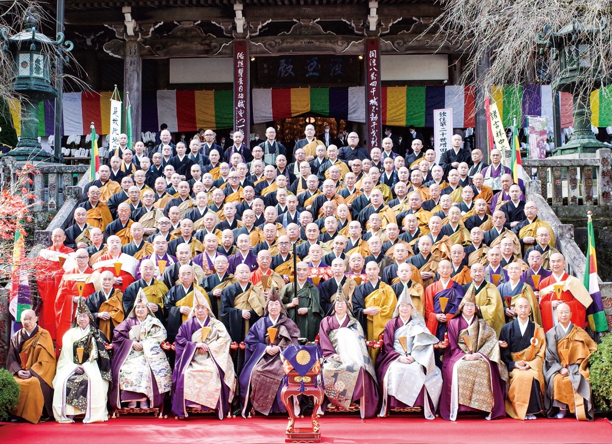 式典は晋山式、晋山上堂、開山報恩諷経と厳かに執り行われ、本堂前階段では記念写真が撮影された=写真。