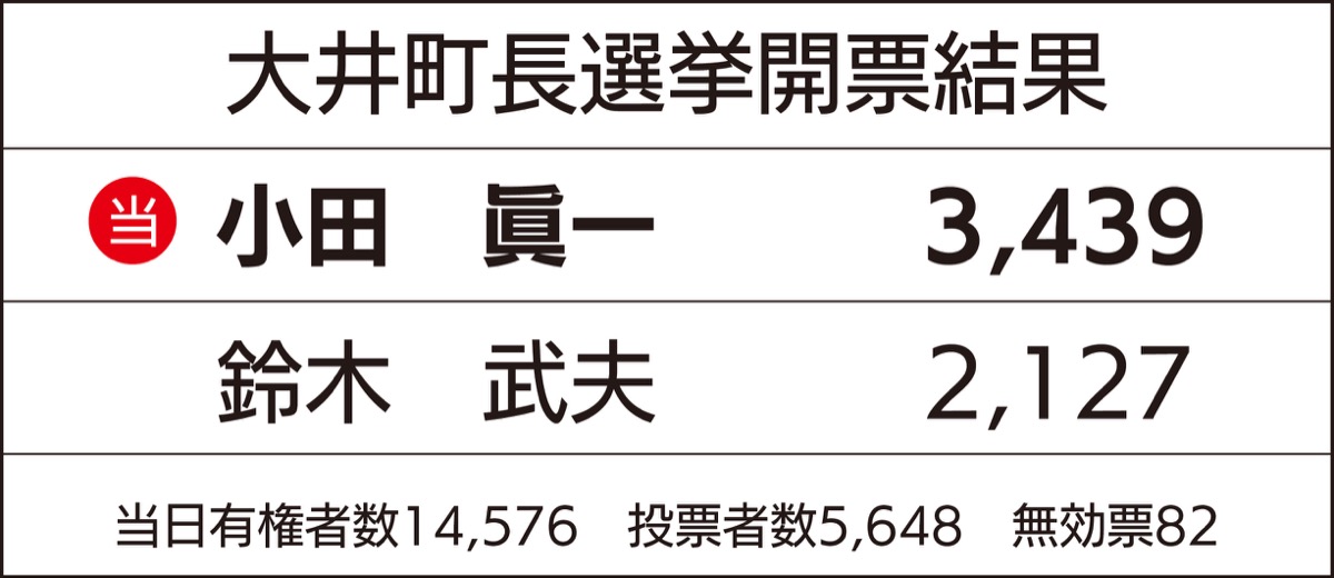 任期満了に伴う大井町長選挙は12月11日に投開票され、現職の小田眞一氏(69)が元町議の鈴木武夫氏(70)との一騎打ちを制し、再選を果たした。投票率は38・75%。2018年の前回選挙を9・62ポイント下回り、過去最低を更新した。