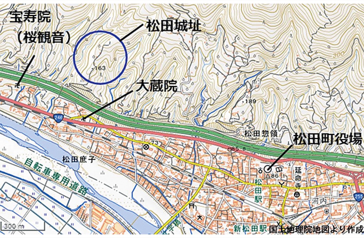 この連載では、松田城に関わる古文書や絵図、石碑、出土遺物などの紹介を通して、松田城の魅力について迫りたい。