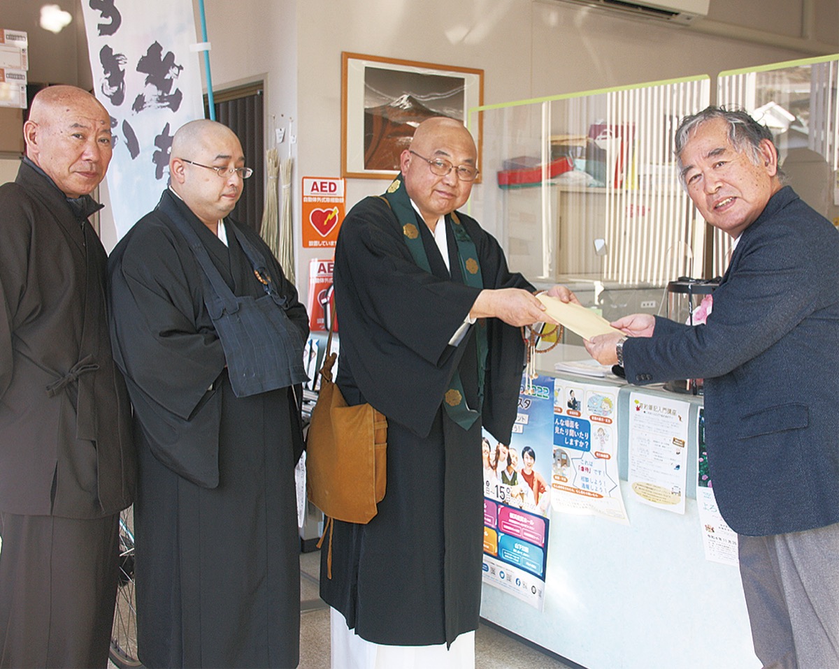 足柄上郡5町にある寺院で構成される足柄仏教会の藤井宏映会長らが12月12日、山北町社会福祉協議会(福岡健一会長)を訪れ、加盟寺院で募った計14万2918円を寄付した。浄財は11月から1カ月ほど掛け、各寺院で募金を呼び掛けるなどして集めた。