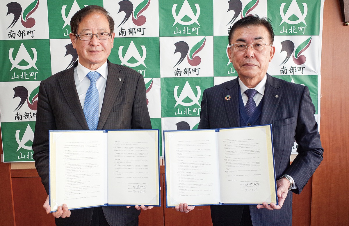 山北町(湯川裕司町長)は昨年12月19日、山梨県南部町(佐野和広町長)との間で、災害時における相互応援に関する協定を締結した=写真。