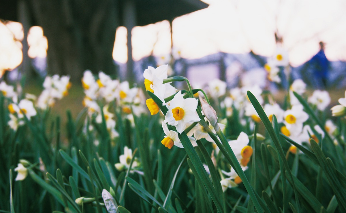 南足柄市班目の大口広場で、スイセンの花=写真=が見頃を迎え、行き交う人たちの目を楽しませている(1月7日撮影)。近隣住民によると、この冬は天候や寒さの影響からか、例年よりやや遅い開花。12月初めにちらほら咲き始め、1月になってから多くが開花したという。