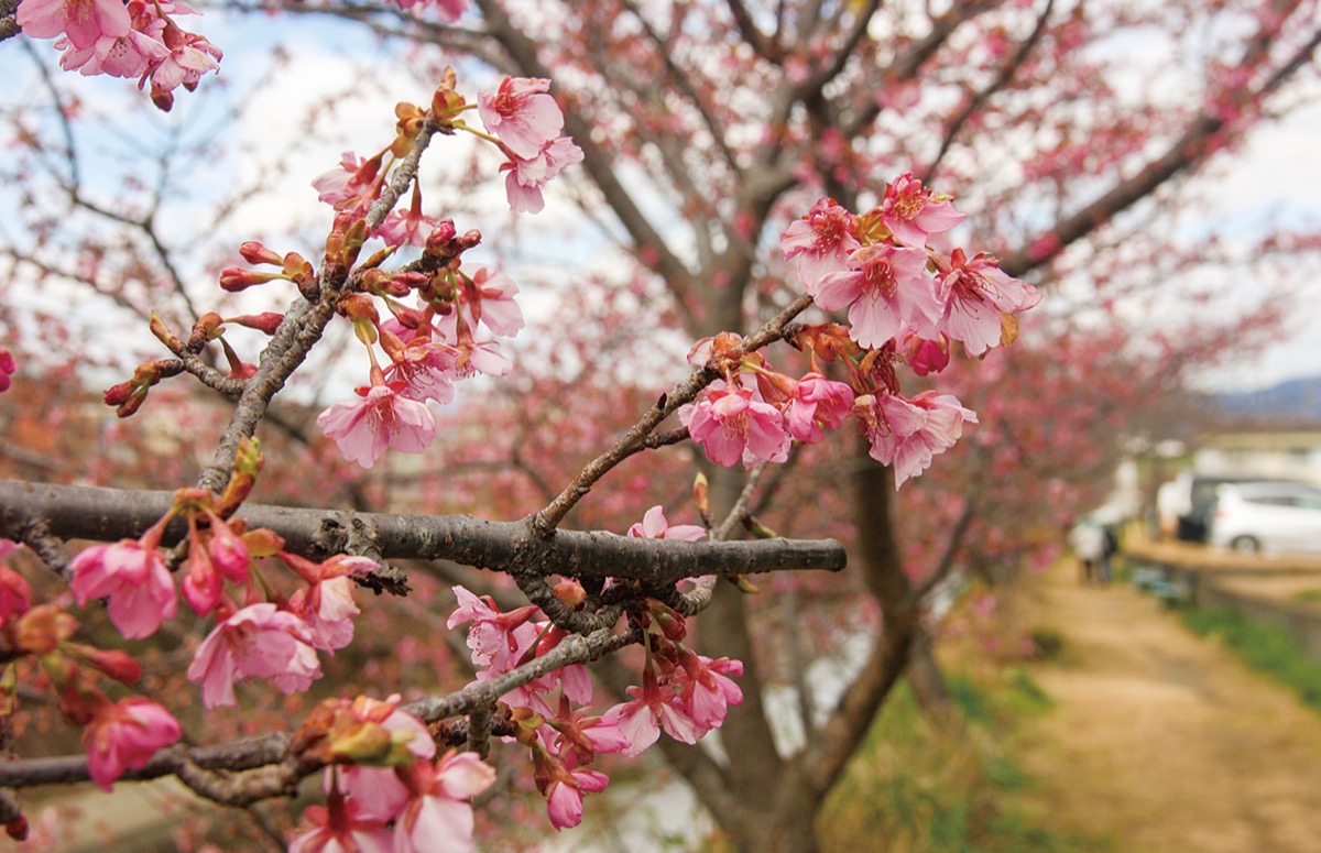 地元の有志たちが植えた35本ほどの河津桜が並んでおり、寒風に揺れる濃いピンク色の花が、行き交う人の目を楽しませている。