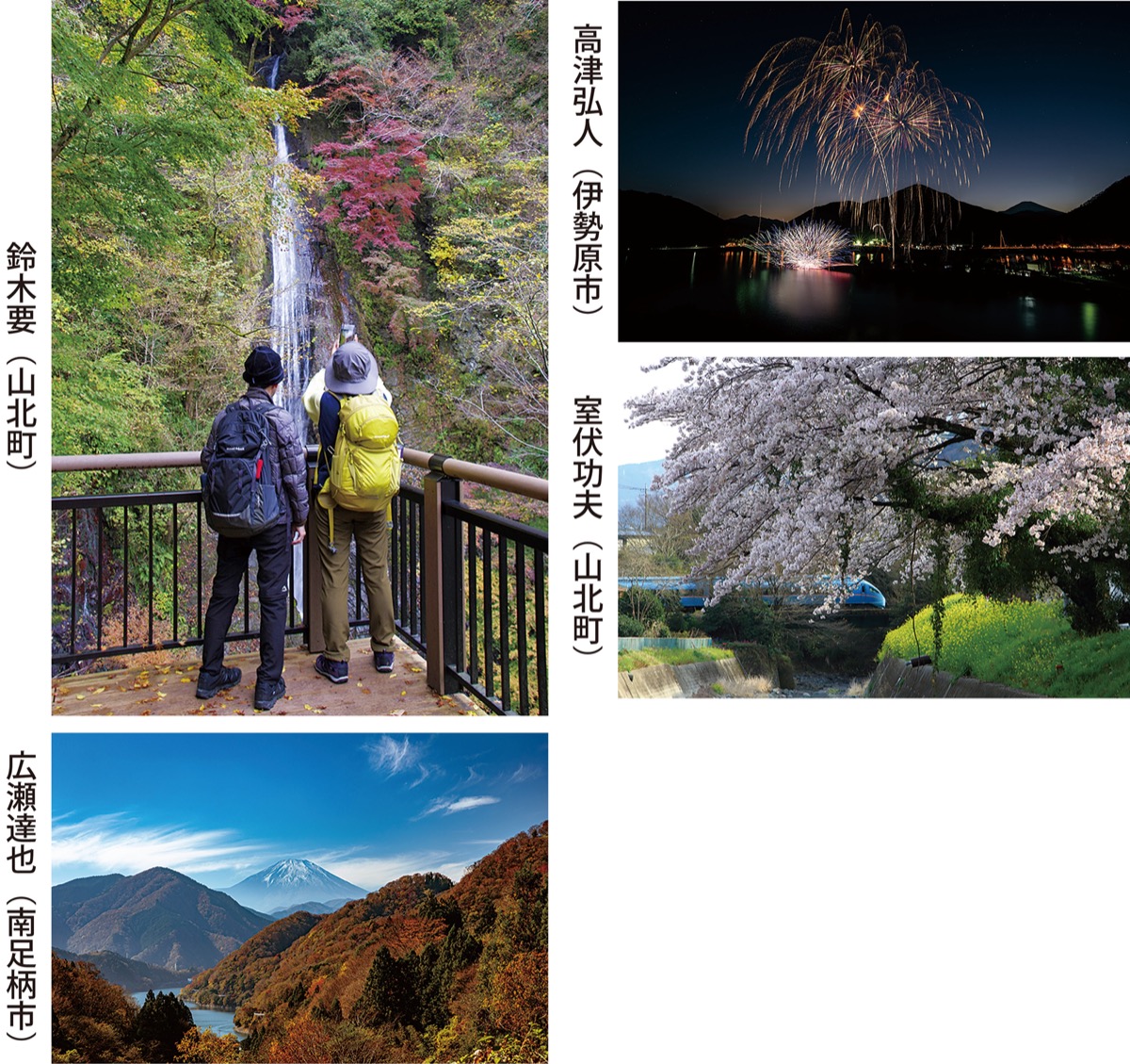 ▼推薦/「丹沢湖 師走の花火」山北町観光協会長賞・高津弘人(伊勢原市)▼特選/「名所復活」神奈川県知事賞・鈴木要(山北町)、「春の詩」山北町長賞・室伏功夫(同)、「秋色に染まった丹沢の山」環境整備公社理事長賞・広瀬達也(南足柄市)▼入選/「河村城址の春」神奈川県観光協会賞・藤山正昭(同)、「一射入魂」同賞・清水進(海老名市)、「ミツマタの咲く頃」中川温泉組合長賞・碓井一海(南足柄市)、「照葉の中で」同賞・香川由美子(開成町)。