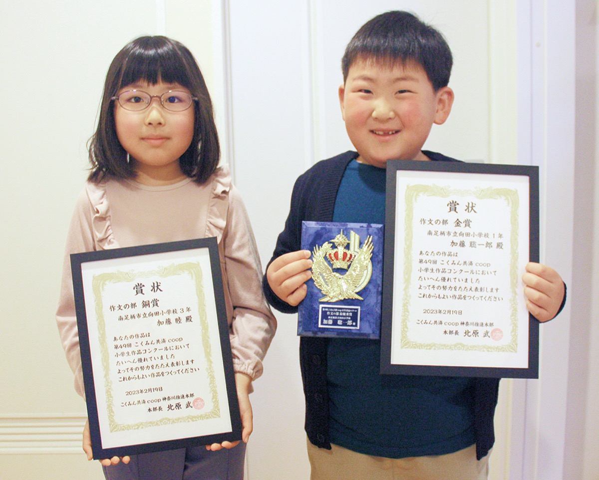 関東各都県と山梨県を含む1都7県の小学生を対象にした「第49回こくみん共済coop小学生作品コンクール」(主催・全労済)の作文の部でこのほど、南足柄市立向田小学校の加藤聡一郎君(2年、受賞時1年)が、県の学年ごとの審査で金賞、全エリアの金賞受賞作から学年別に審査する中央コンクールで最優秀賞を受賞したほか、姉の睦さん(4年、同3年)が県で銅賞に輝いた。