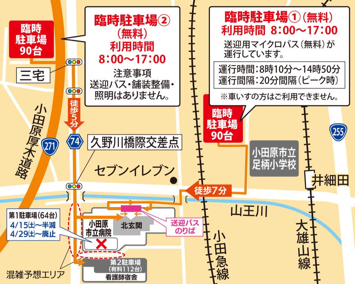 臨時駐車場は足柄小学校向かいと、旧JT小田原工場跡地(三宅交差点そば)一角=図参照=の2カ所。どちらも午前8時から午後5時まで利用可能で、足柄小向かいからは無料送迎バスの運行も行われている。