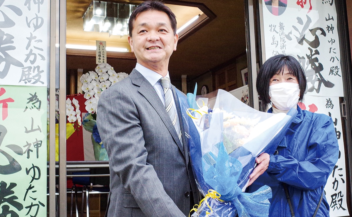 山神氏は前回の町長選挙で府川氏との一騎打ちの末に32票差で敗れ、今回が2度目の挑戦だった。亡き父の輝氏も元開成町長で、親子二代での町長就任となる。