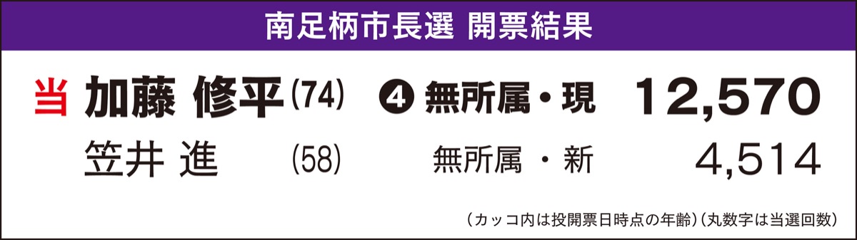 任期満了に伴う南足柄市長選挙は4月23日に投開票され、現職の加藤修平氏(74)が新人で元市商工会長の笠井進氏(58)を大差で破り、4回目の当選を果たした。投票率は50・85%だった。