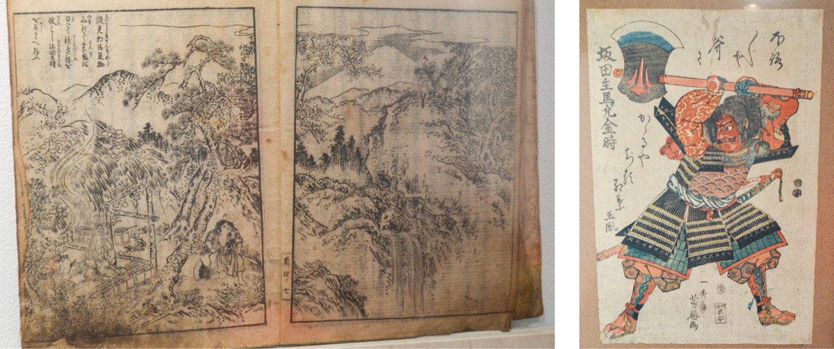 この軍記物語は江戸時代に人気を博し、歌川芳勝の浮世絵や近松門左衛門の演目にも描かれたという。「これらの作品に金太郎の名前は出てこないが、平安時代に既に成立している金太郎のおとぎ話と内容が一致している。あるときから2人の人気キャラクターは結び付き、同一人物視として広く知られるようになったのだろう」と、40年以上かけて集めた史料や郷土玩具、絵本など約300点の資料を基に解説。足柄地域には、金太郎伝説を伝えるスポットが点在し、今も継承されている。