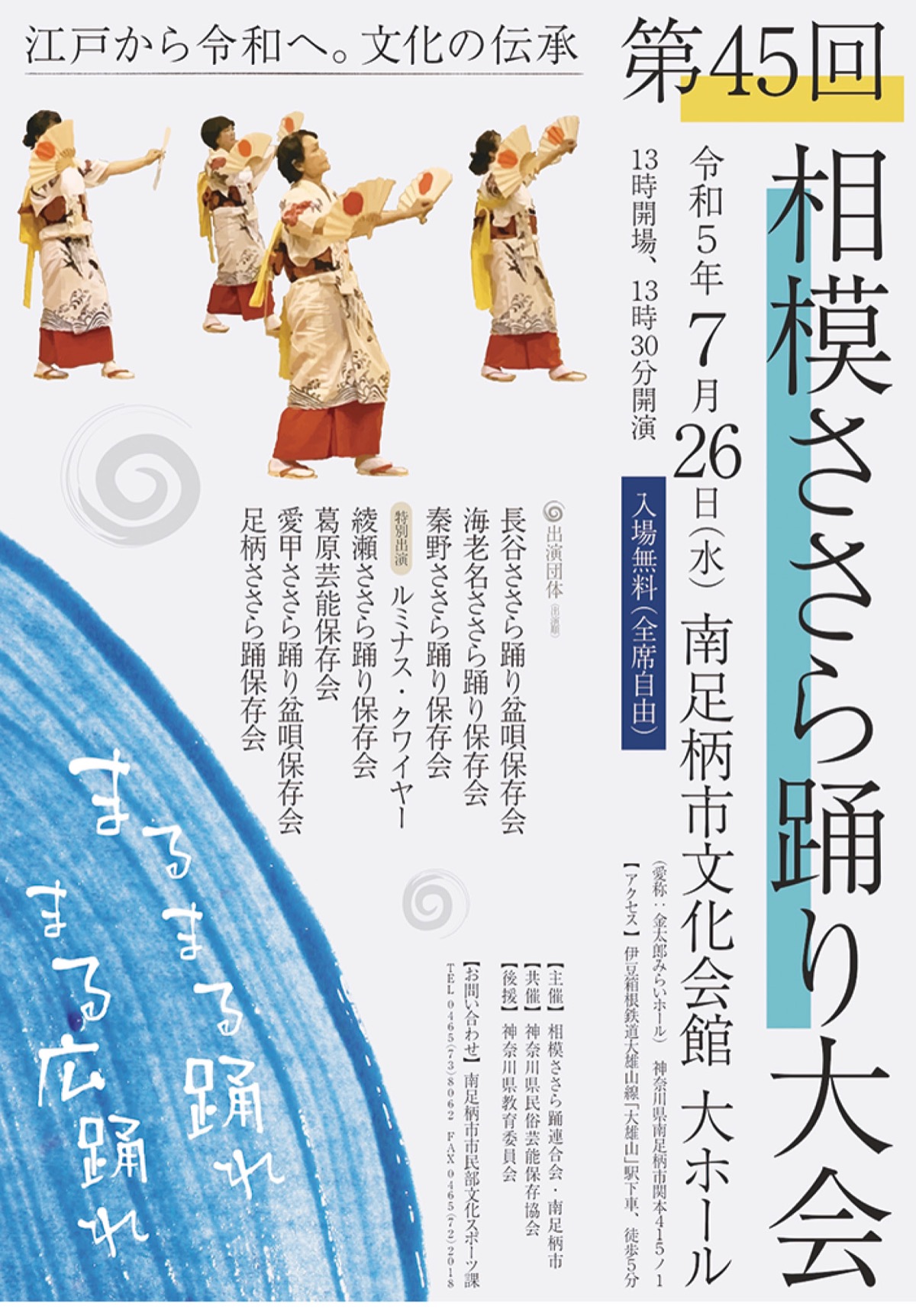 出演団体は▼長谷ささら踊り盆唄保存会▼海老名ささら踊り保存会▼秦野ささら踊り保存会▼綾瀬ささら踊り保存会▼葛原芸能保存会▼愛甲ささら踊り盆唄保存会▼足柄ささら踊保存会。