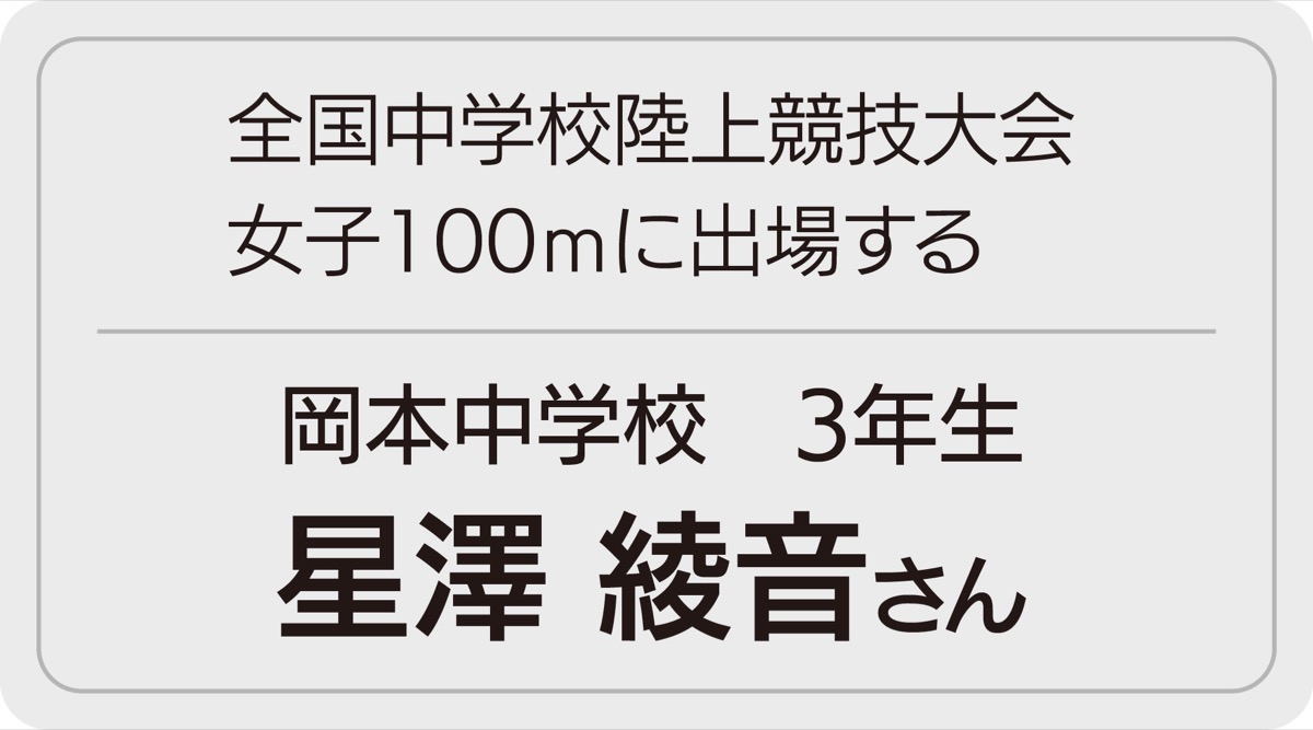 岡本中学校3年の星澤綾音さんは7月2日に行われた「第36回神奈川県中学校選抜陸上競技大会」の女子3年100メートルで優勝、予選で全国標準記録(12秒53)を超える12秒40を記録し、8月から開催される全国大会への切符を掴んだ。また、17日の全日本中学校通信陸上競技神奈川県大会でも12秒35のタイムを出した。思うような結果が出なかった昨年の雪辱を果たすべく、1回1回の練習に集中して取り組む日々を送っている。「今年は決勝に残り、速い人たちと競いたい」と闘志を燃やす。