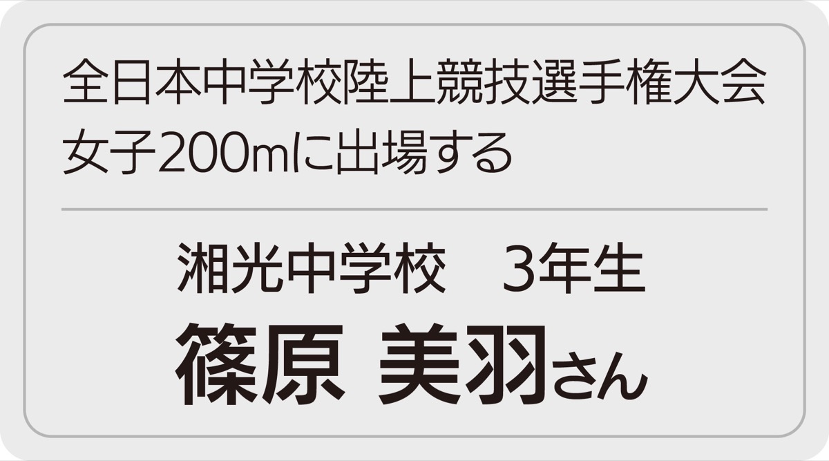 湘光中学校3年の篠原美羽さんは7月21日に行われた「第69回全日本中学校通信陸上競技神奈川県大会」の女子200メートル決勝で全国標準記録(25秒80)を超える25秒62を記録し、8月22日から開催される全国大会への出場を決めた。全国出場が懸かる最後のチャンスで見事に自己ベストを出し、切符を掴んだ篠原さん。「目標だったので、決まった時はほっとした。レベルの高い人たちが集まるが、雰囲気にのまれず自分の走りをしたい」。持ち前の勝負強さでベスト16入りを目指す。