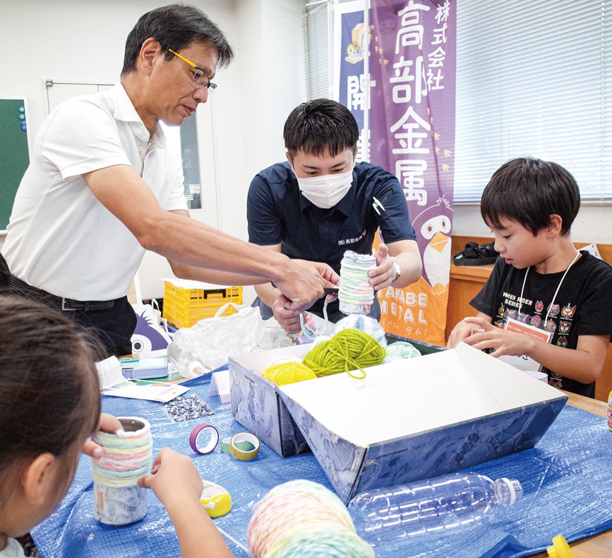 この日は市教委主催で、事前の募集で集まった小学1年生から3年生約15人が参加。缶とペットボトルのリサイクル意義やSDGsの取り組みに関し、動画やクイズを通して学んだ。また、アルミ缶を使ったプランターやプラスチック片を使ったキーホルダーづくりに取り組んだ。体験型の講座は反応も上々だといい、この日も定員満員の盛況ぶり。「作るのが楽しい」とこどもたちも笑顔だった。