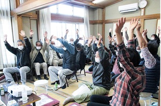 町保険健康課職員と同地区在住の尾崎キクヱさん(78)と尾崎洋子さん(77)が昨年11月、コロナ禍で外出機会が減り自宅に閉じこもってしまう高齢者が増加していたため企画した同イベント。同地区に住む70〜80代の住民が集まり、夏には盆踊り、12月にはハンドベルなど、毎回内容を変えながらレクリエーションを行っている。また、地元診療所の医師と保健師もたびたび参加し、健康講座を開いている。