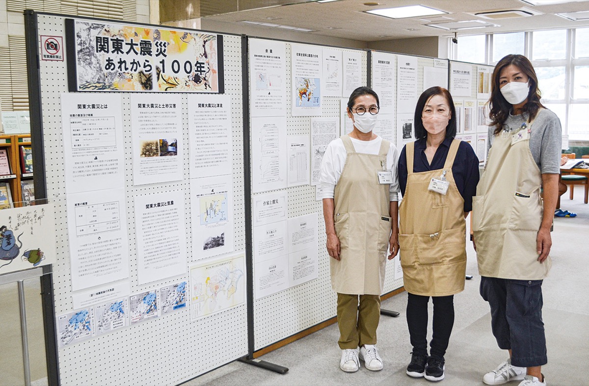 関東大震災から100年の節目に防災についての意識を高めてもらおうと図書館スタッフの八巻恵美子さん、加藤由加里さん、砂崎友梨さんが企画した。関東大震災の概要のパネルや市内小学校に残る学校沿革誌、同館所蔵の震災当時の資料などから、南足柄市内では土砂災害が多かったことや被害の状況などを学ぶことができる。9月30日(土)まで実際に計測中の地震計の展示などもある。