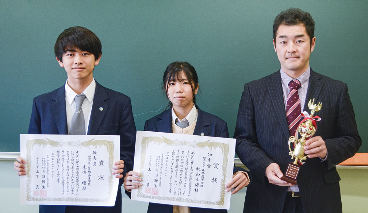 足柄高校歴史研究部(桐生海正顧問)の秋山七海さん(18)と米澤檜さん(18)が「全国高校生歴史フォーラム」(奈良大学・奈良県主催)で優秀賞を獲得した。さらに11月25日に同大学での最終審査の結果、秋山さんが知事賞を受賞した。
