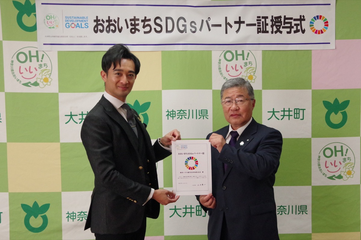 持続可能なまちづくりを企業や団体と連携して取り組む大井町が11月30日、積水ハウス(株)湘南支店へのSDGsパートナー証授与式を行った。同町はSDGsの普及促進活動を行う企業などに「おおいまちSDGsパートナー」参加を広く募集しており、今回は35例目となった。