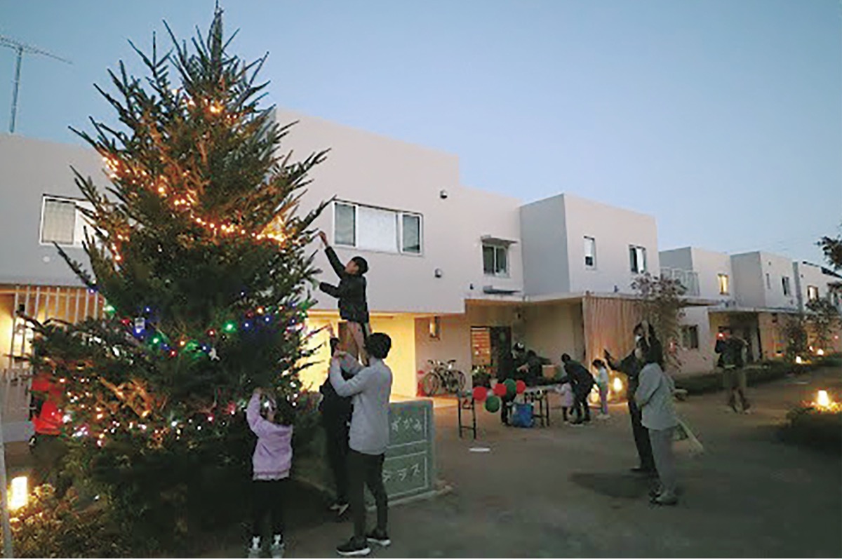 山北町向原にある町営住宅「みずかみテラス」で12月7日、クリスマスツリーがお目見え。毎日午後5時から点灯し、水上地区を照らしている=写真。