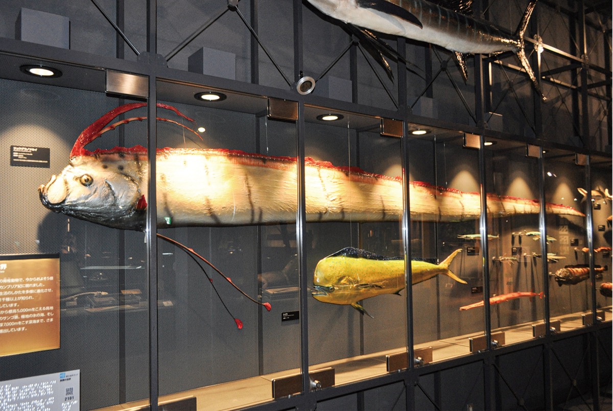 リュウグウノツカイはアカマンボウ目リュウグウノツカイ科に属する魚。光は届くが光合成ができない水深帯に生息している。展示の剝製は、1990年7月18日に小田原市の御幸の浜に衰弱して漂着したもので全長は約4・2mある。