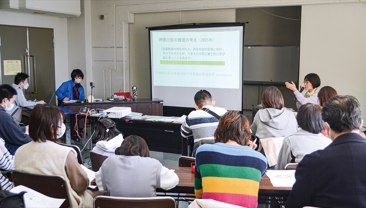 障害がある児童も通常の学級と同じ教室で授業を受ける「フルインクルーシブ教育」の実践事例などを学ぶ学習会が2月12日、大井町生涯学習センターで開催された。