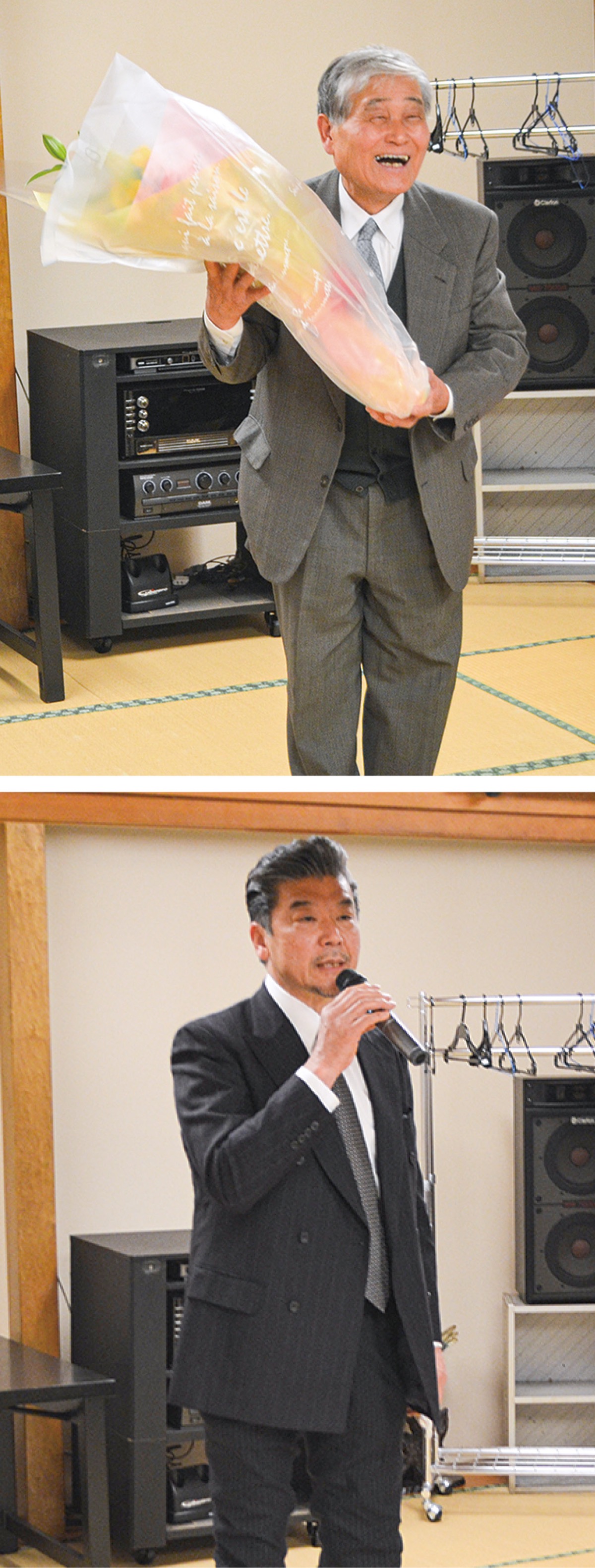 総会後の懇親会には市長や商工会長、近隣町の飲食店組合長、飲食店関連の企業担当者などが出席。はじめに挨拶に立った前組合長の満本充氏はコロナ禍で飲食店が苦境に立たされたことに触れ「環境が大きく変わった中で多くの飲食店が生き抜いてこられた。これは各店の努力の賜物」と話し、組合員から花束を受け取った。続いて、山本氏が「微力ながら組合活動に貢献していきたい。どうぞよろしくお願いします」と話した。選考委員長の黒木弘行氏は「この組合は50〜60代の熱心な組合員に恵まれている。若い力で今後も南足柄を盛り上げていってほしい」と話した。