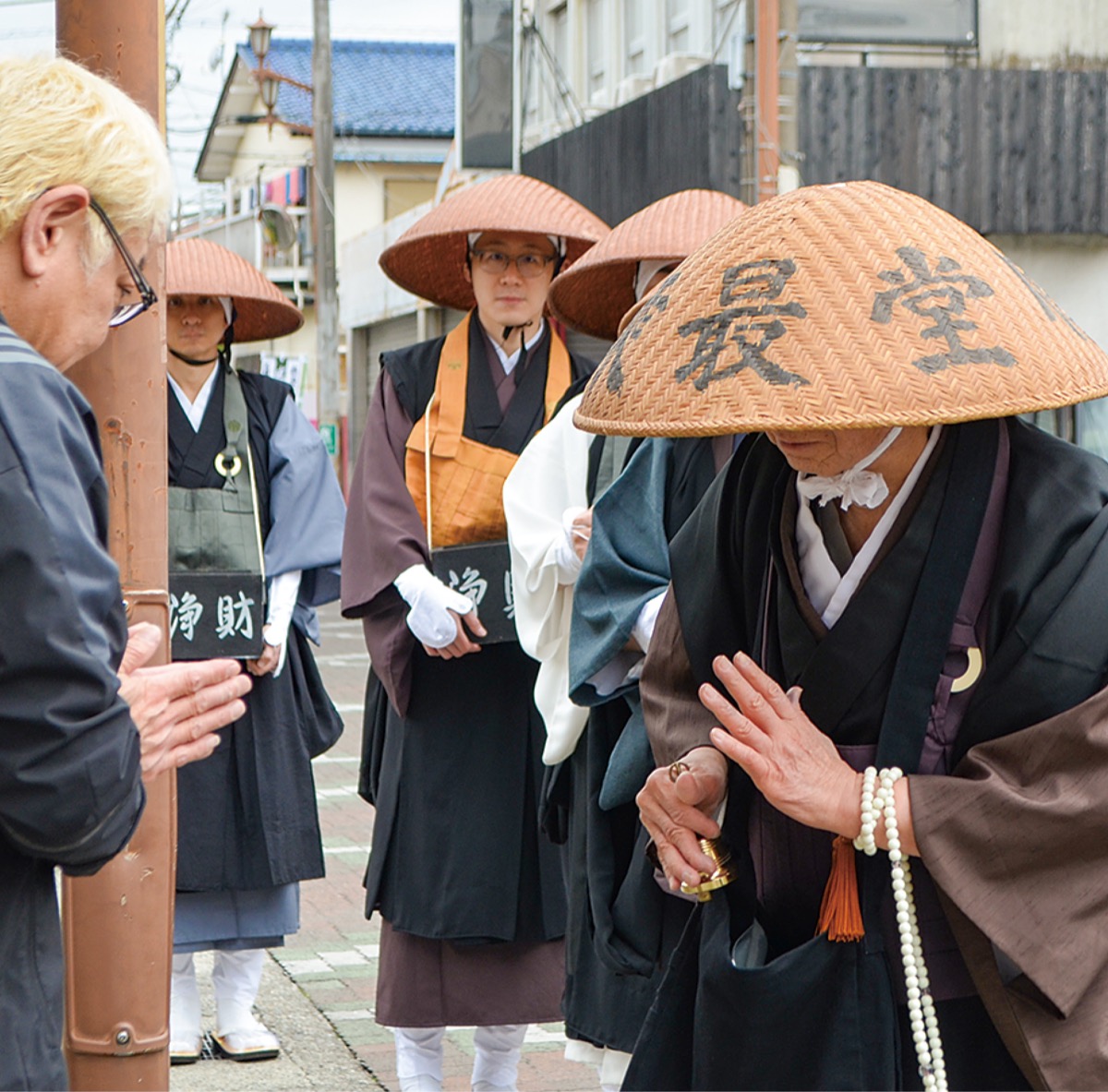 当日は神奈川県第一宗務所青年会の僧侶をはじめ、研修の一環で大雄山最乗寺に修行に訪れていた駒澤大学高校、鶴見大学付属高校の生徒7人など計約30人。中には同寺の山主、増田友厚老師の姿も。関係者によると山主自らが托鉢を行うのは珍しいという。僧侶らは般若心経の一節を唱えながら駅周辺の道を歩き、通行人や商店から浄財を受け取った。