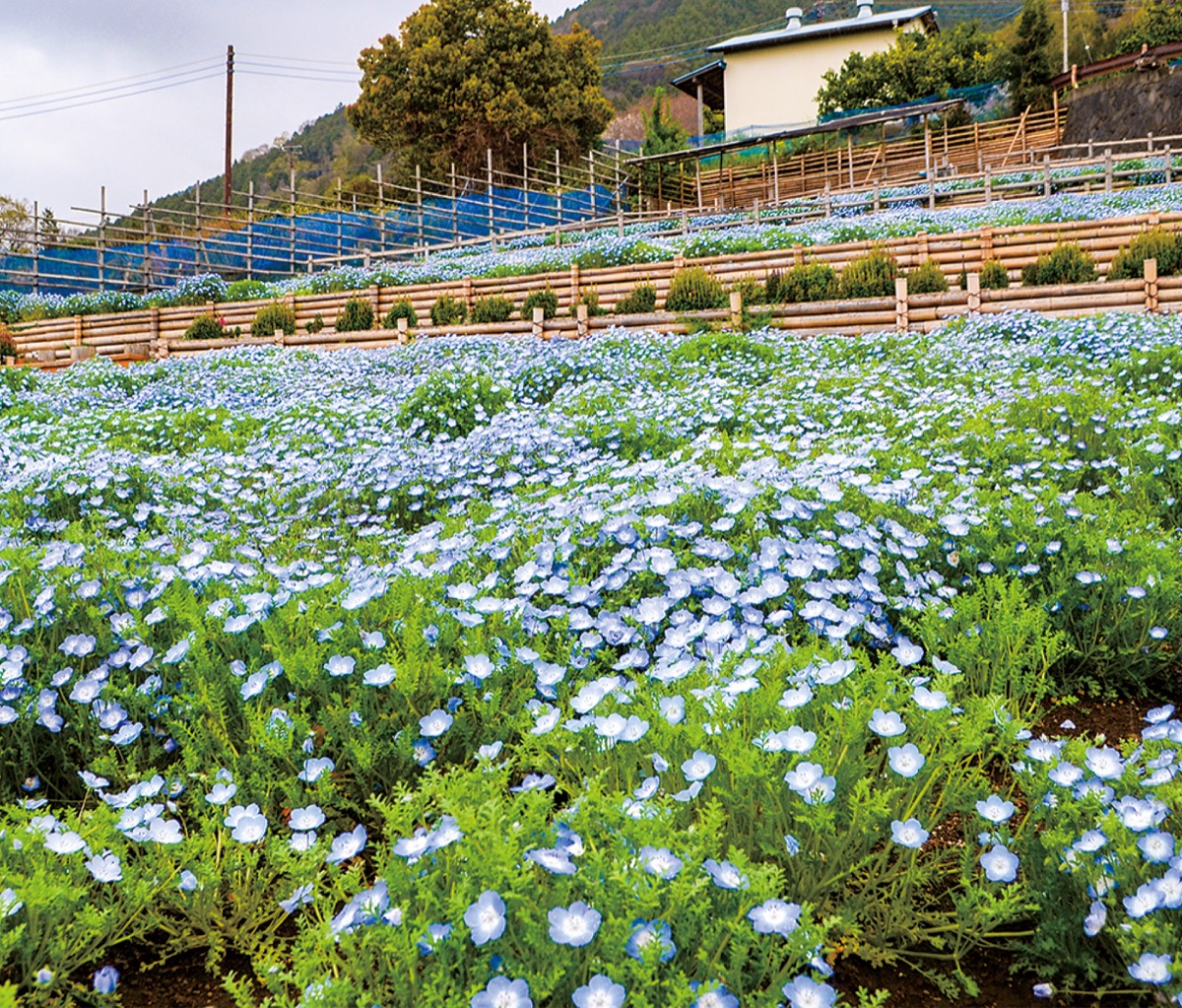 4月に入り松田町にある「コキアの里」では瑠璃色の花を咲かせたネモフィラ約4000株が見ごろを迎えている。