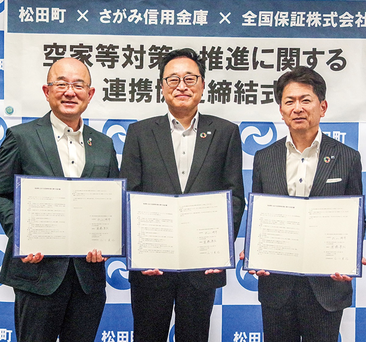 地域課題に民間と連携して取り組もうと松田町は6月18日、さがみ信用金庫、全国保証(株)と「空家等対策に関する協定」を締結した。町内の空き家購入の際に融資取引を優遇する独自のローン商品を展開するなど、3者が協力して実効性のある対策を推進していく。