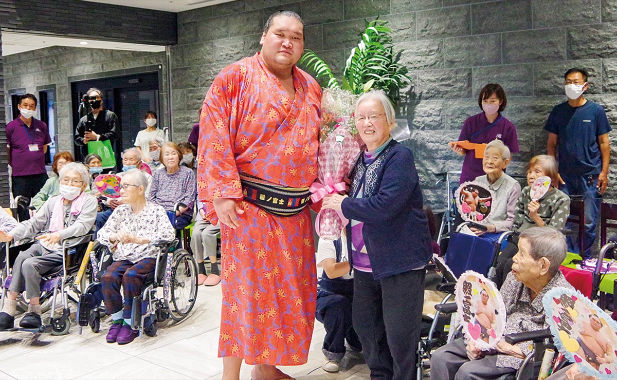 大相撲の第73代横綱、照ノ富士が6月12日、開成町の介護施設サウスマークとサウスポートを訪問し、利用者らと交流した=写真。