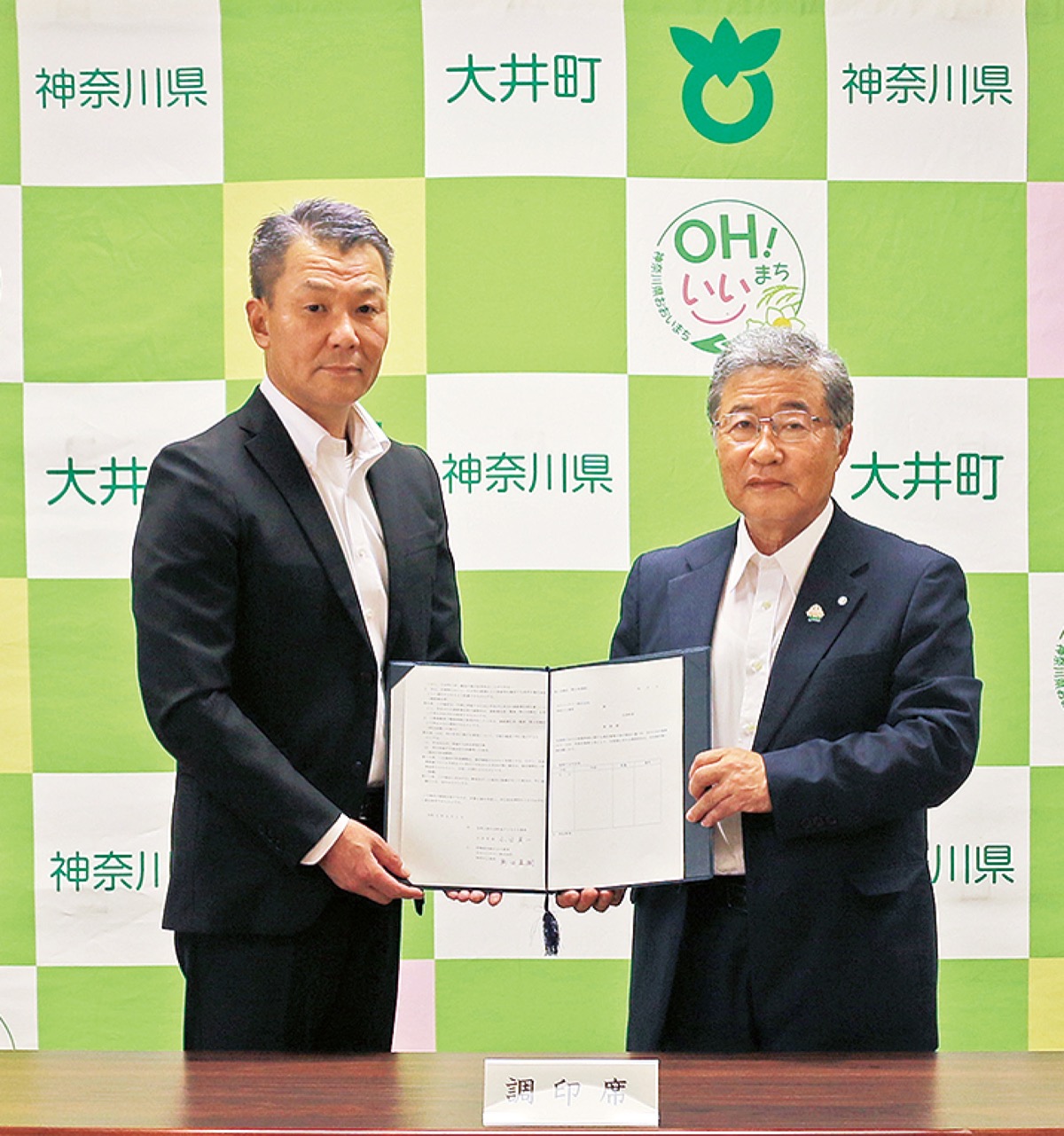 大井町は6月26日、段ボールシート・ケースの製造販売を行う王子コンテナー株式会社と「災害時における物資供給に関する協定」の調印式を、大井町役場で行なった。
