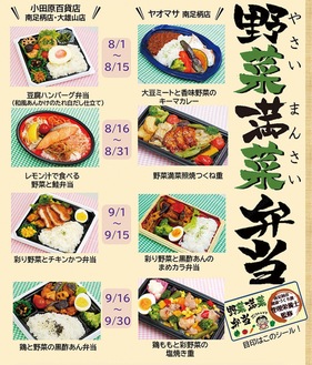 弁当は市健康づくり課の管理栄養士が監修。1食あたりの野菜や食塩の摂取量が望ましい値となるよう、総菜の組み合わせなどを工夫。全8種類(各社4種類ずつ)あり、期間を分けて各社1種類ずつ販売している。販売は小田原百貨店の南足柄店・大雄山店、ヤオマサの南足柄店。