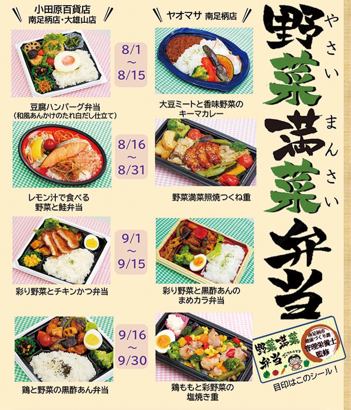 8月31日までは「レモン汁で食べる野菜と鮭弁当」(小田原百貨店)、「野菜満菜照焼つくね重」(ヤオマサ)が販売中。弁当は管理栄養士監修のマークと、南足柄市のキャラクター「よいしょ君」が描かれた特製シールが目印。市は「日々の食生活の参考にしてみてください」と話している。