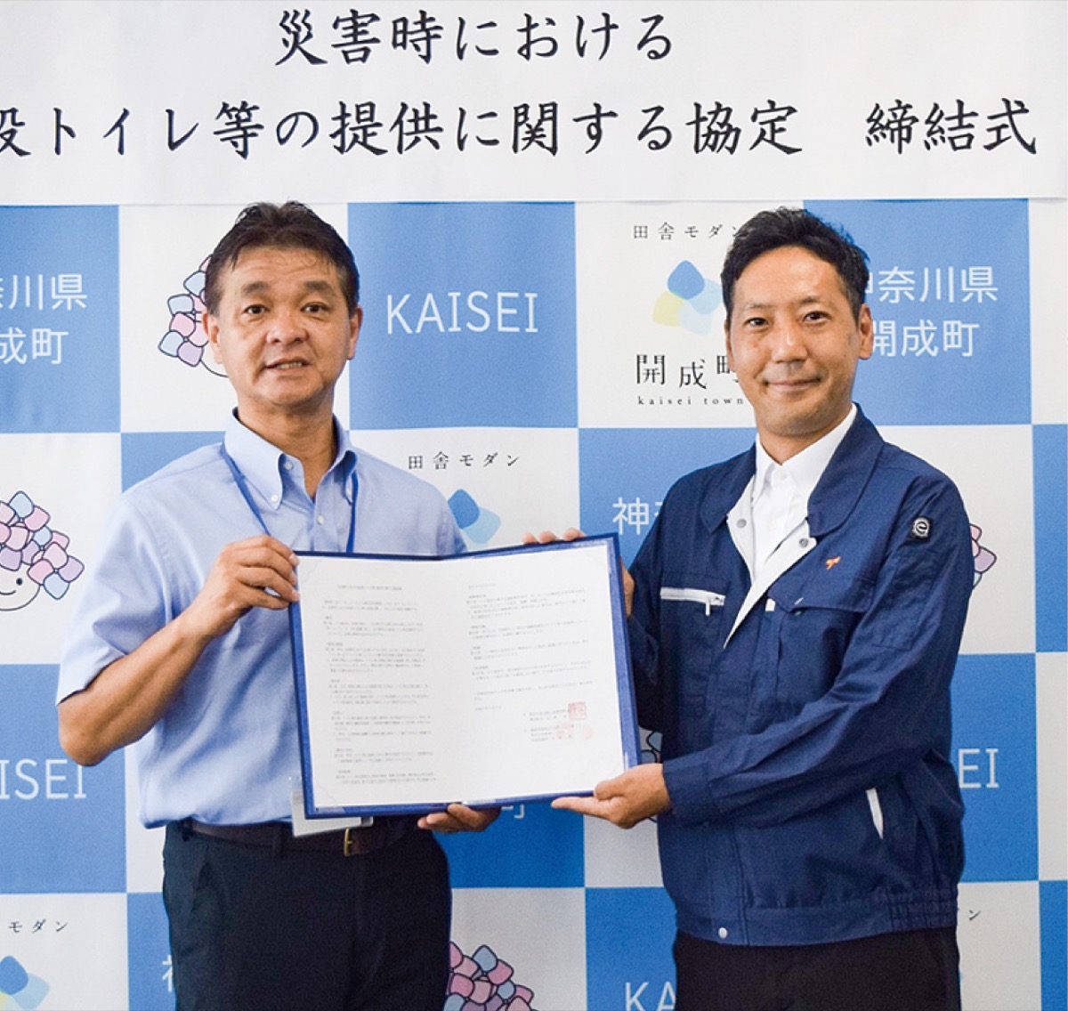 開成町は、水や汲み取りを必要としない福祉バイオトイレカー提供に関する協定を移動式トイレを扱う民間会社と、5月に提供に関する協定を締結している。今回の協定では、大規模災害による断水発生時に、指定避難所等で使用する仮設トイレや水槽タンクなどを提供してもらうことで、災害時のトイレや水不足の対応強化を図られる。