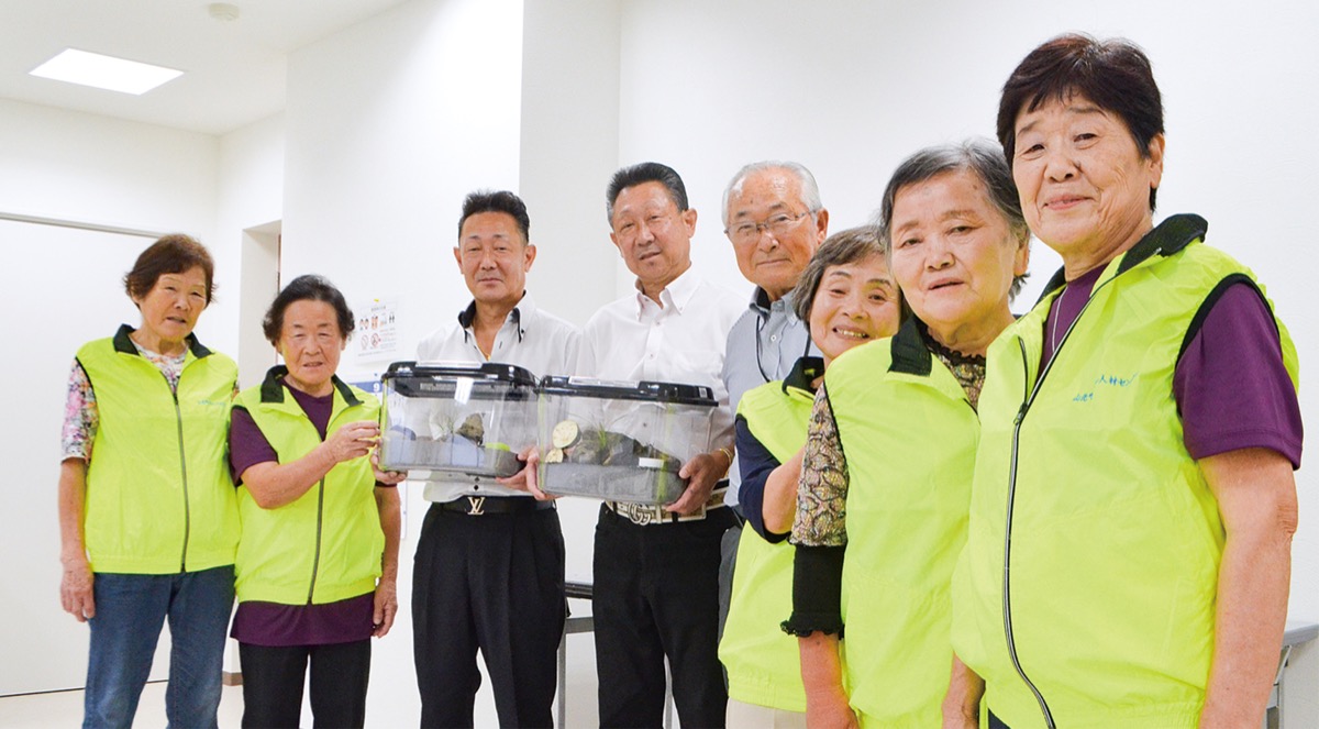 この日は同センターの山崎正次理事長と飼育を担当した大胡田ふじ子さん、山崎みさゑさん、奥津一江さん、松浦通子さん、渡辺美佐子さんが出席。出迎えた湯川理事長、湯川謙吾統括本部長に鈴虫を手渡した。湯川理事長は「施設ではいろいろな生き物を飼育している。鈴虫も責任を持って世話をして、来年には私たちのところでも繁殖に成功できるようがんばります」と感謝を述べた。山崎理事長は「女性会員たちの心遣いがカタチになった今回の『秋の合唱隊』企画。こうした活動は私たちシルバー人材センターの活動にも元気をくれるものだと感じています」と話した。