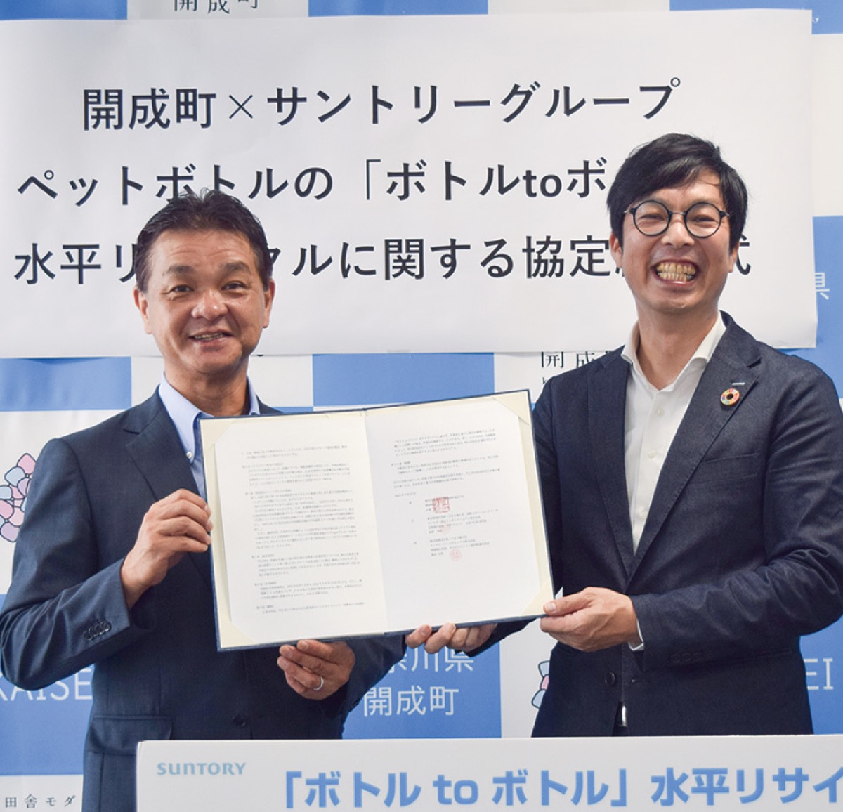 開成町は9月17日、サントリーグループ2社と使用済みペットボトルを再生する「ペットボトルの”ボトルtoボトル”水平リサイクルに関する協定」を同町役場で締結した。