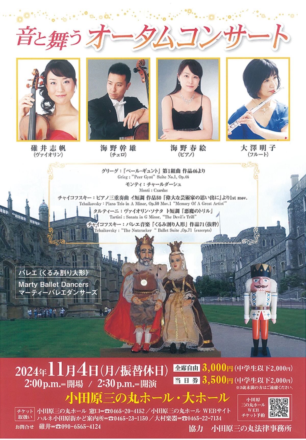 出演はヴァイオリンの碓井志帆、チェロの海野幹雄、ピアノの海野春絵、フルートの大澤明子。そして、マーティ バレエ ダンサーズ。