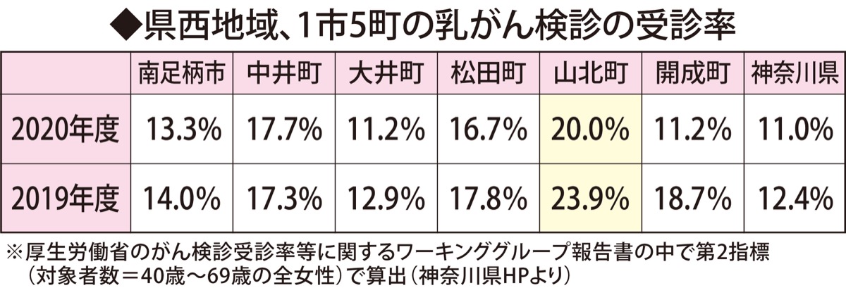 10月は乳がん月間。県が発表する最新データである2019年度、20年度の乳がん検診の受診率で、足柄上地域(南足柄市、中井町、大井町、松田町、山北町、開成町)は、1市5町とも県平均より高く、中でも山北町は県内で2番目に高かった。
