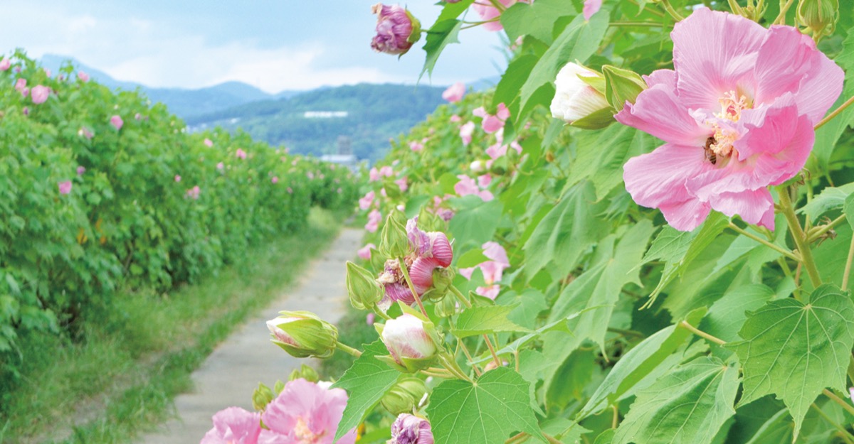 公園脇の農道では約1キロメートルに渡り花をつけており、背丈を超える花の壁の間を歩くような感覚だ。市によれば、酔芙蓉は700本、芙蓉は100本あるという。29日(日)まで「酔芙蓉まつり」と題し、農産物の販売や模擬店の出店が行われる。まつり会場付近に25台程度の駐車場有。詳細は市観光協会HP。