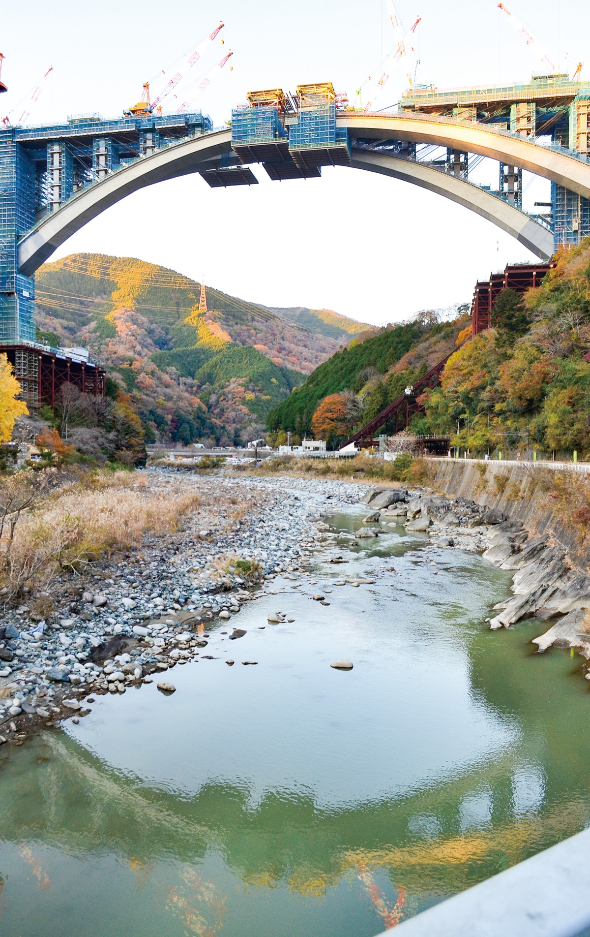 バランスドアーチという形式で日本最大級の河内川橋。水鏡で生まれる「大きな円」も日本最大級ということになるのかもしれない。