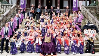 男の子は烏帽子、女の子は飾りのついた冠を頭にかぶり、お化粧をし、着飾った子どもたちが最乗寺の瑠璃門から境内を行列する。