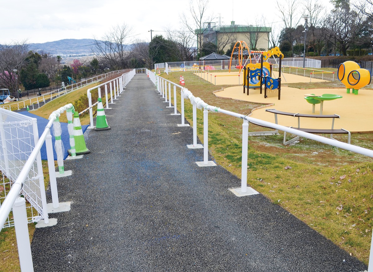 さらに、各エリアをつなぐ園路はスロープ化され、車いすやベビーカーでの移動がしやすいように設計。広場内に、新たに30台分の駐車場と入口付近に身体障害者等用駐車場を3台分増設し、トイレも洋式化した。