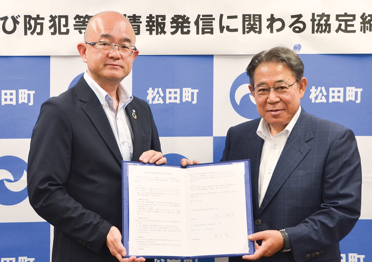 町の防災対室で実施された協定式で本山町長は「情報発信に関わる協定は町にとって初めて。町の防災行政無線の内容をテレビで聞くことができるほか、定点カメラの映像提供など、防災力の著しい強化につながる」と説明。柏手社長も「地域メディアとして、災害時のみならず平時から松田町とより密着して強固な体制を築いていきたい」と返した。