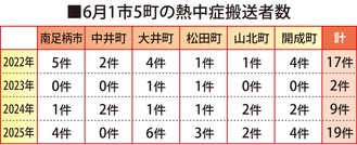 今年は搬送者が早い段階から増えていると言い、6月7日に開成町で今シーズン初となる搬送があった。18日には、同署管内の小田原市で、熱中症により90代の女性が死亡している。