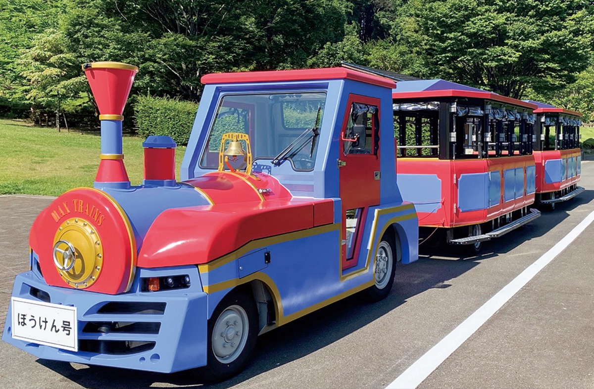 従来のディーゼル式からEV(電気自動車)仕様となったロードトレインの名は「ぼうけん号」。赤と青のコントラストが際立つかわいらしいデザインだ。運行はどんぐりの森駅から冒険の丘駅までで、料金は中学生以上が片道300円、小学生が同100円。未就学児は無料。