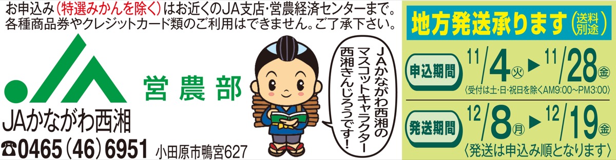 お世話になった人へ感謝を込めて贈る「お歳暮」。JAかながわ西湘では「かながわブランド」にも指定されている大津みかん、キウイフルーツ、曽我の梅干の特産品3種を贈答用にご用意。受付を開始する。