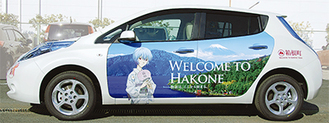 箱根町役場にこのほど、人気アニメ「エヴァンゲリオン」のキャラクターをあしらった電気自動車(EV)がお目見えした。6年間のリースで導入したもので、EV公用車としては4台目。ドア部分に芦ノ湖と人気キャラの『綾波レイ』が描かれたほか、フロント部分には物語に登場する組織「ネルフ」のロゴマーク(左)も入り、ファン垂涎の一台になりそうだ。アニメキャラが入った公用車は他にも練馬区が「銀河鉄道999」のキャラクターをペイントした公用車を導入した例がある。
