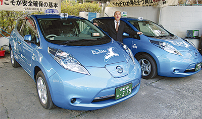 湯河原タクシー(三野弘二社長)と真鶴タクシー(同)が、日産の電気自動車(EV)のリーフと急速充電器を1台ずつ導入した。営業運転は月末頃始まる予定。県では23年度に100台のEVを走らせることを目指しており、導入費の一部補助や税の減免を行っている。地球と人に優しい、というコンセプトのもと、平成25年3月まで障害者割引が通常の1割から2割に拡大される。2社のほか、足柄下郡近隣では小田原市の日本交通小田原(株)、箱根登山ハイヤー(株)、富士箱根交通(株)も導入する。湯河原・真鶴タクシーの古川清一営業部長(2社兼任)によると「音も小さく、乗り心地は最高。体に負担の少ない乗り物」だという。